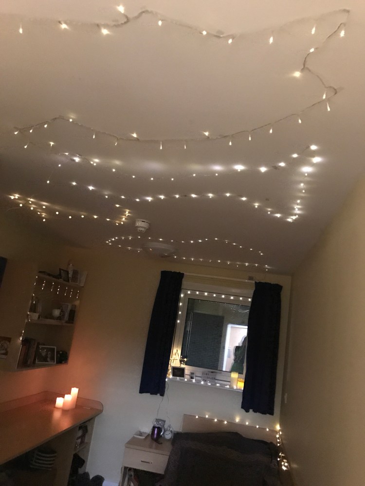 In all four of my uni flats I’ve filled my room with fairy lights, floor to ceiling, and used this as my only light source. They fit everywhere, around your bed, over the window, by the doors and around your desk, just to name a few places. It creates such a dreamlike atmosphere; you can lay in bed and watch all these “stars” light up your ceiling. Fairy lights are also great background lighting for tea and movie nights with your friends. Just be prepared for the hassle it is taking them down at the end of your tenancy.