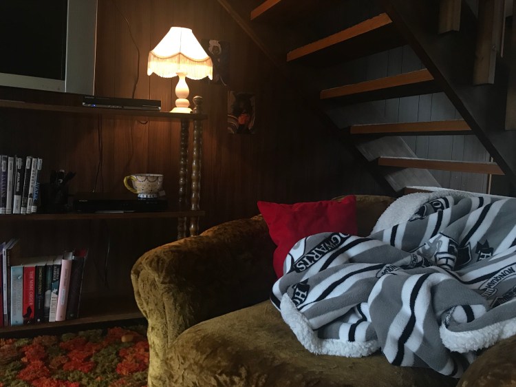 As you can see from the background of these photos, all my reading (that’s not uni course related) is happening in one place. I’ve made myself a cosy, little reading nook. It’s a small-esque chair, nestled under the stairs. It’s got a lamp and a bookshelf right next to it, and my favourite Harry Potter-blanket, the only thing I brought with me from my flat in Winchester to this new uni home. I figured I’d put in a picture of my cosy nook at the end, but before that; let’s look at some books!