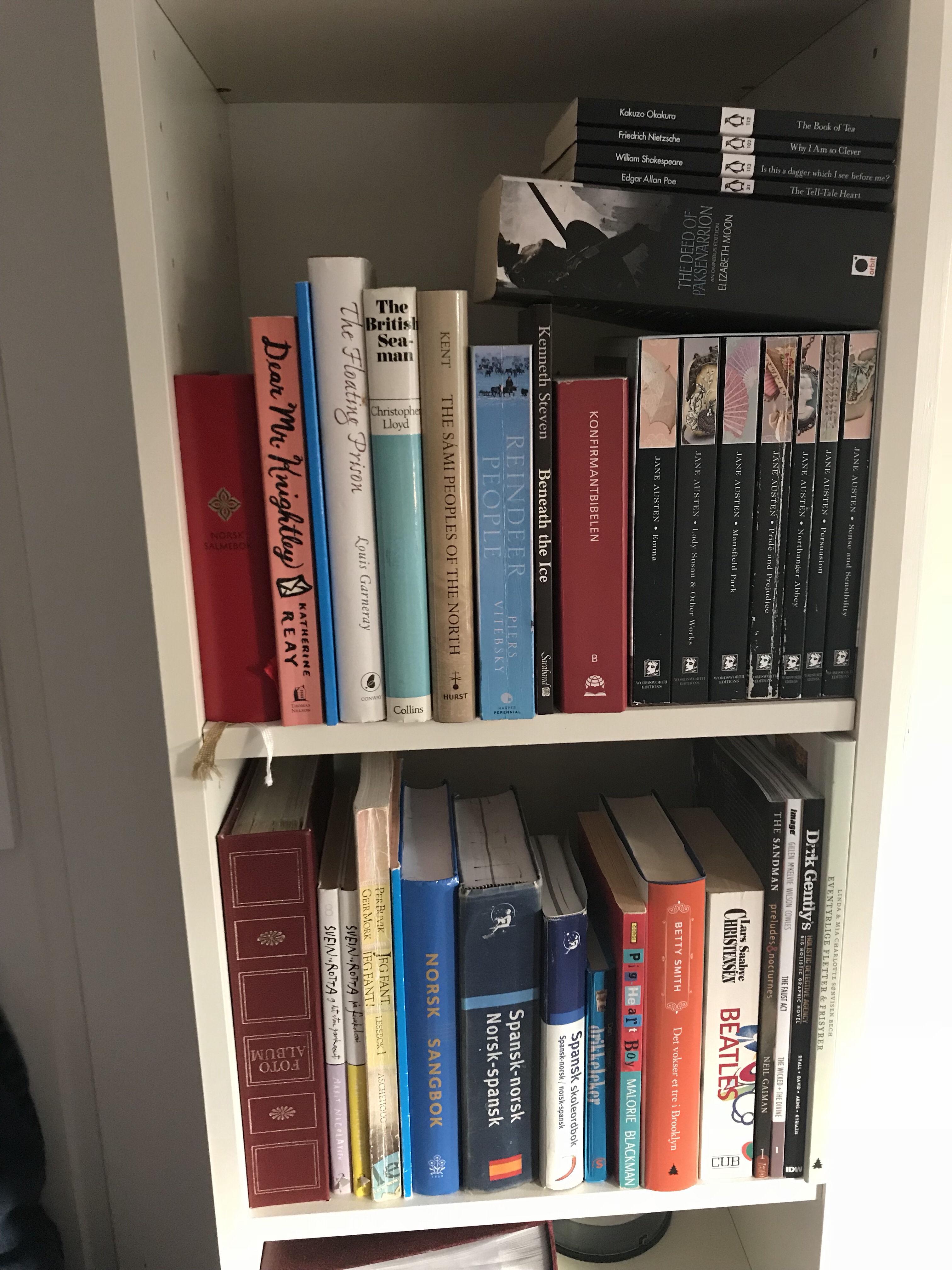 My bookshelf is a a chaotic mess, and I’ve gone through so many different ways of organizing it throughout the last couple of years. Colour-coordinated, organised by genre, height, alphabetical order, year of publication – you name it, my shelves have probably seen some attempt at it. I also originally tried to have one Norwegian and one English shelf, but quickly discarded the idea. As you can see, I’ve got a little Norwegian shelf on the top there, but that’s only Norwegian children’s books. I’ve got both English and Norwegian editions of a lot of books, and I wanted to keep those together, plus I like having the different languages together, as it kind of represents how languages can mix in your head! Now, most of the books I care the most about (I’m big on nostalgia, gotta be real with you) are organized by authors (not alphabetically, though) there is a poetry-and-fairytales-shelf, a shelf for old “fandom” books (Doctor Who, Torchwood, Supernatural, etc.), all of my uni books are sitting together on the bottom shelf there, and there is a top shelf filled with both well-loved and unread classics.